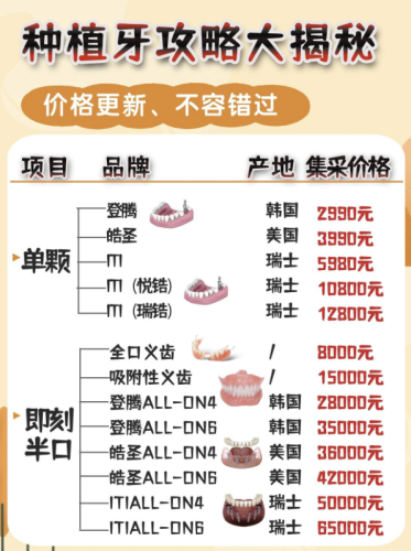 | 半口种植套餐 | All-on-4 技术(4-6 颗种植体)+ 全瓷桥 | 80000-150000 元 | 比单颗累计购买省 15000-25000 元 | 半口多数牙缺失、高龄人群 |
