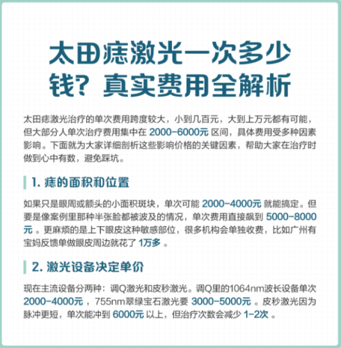 | 太田痣面积 | 小型(<5cm²) | 400-800 元 / 次 | - | 轻度颜色,调 Q 激光即可,总花费 3000-6000 元 |