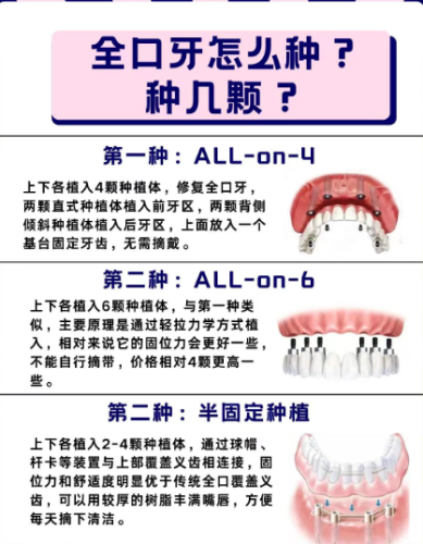 全口种植牙:传统方式需植入 8 - 12 颗种植体,价格在 12 - 30 万元;allon4/6 技术植入 8 颗种植体,价格在 15 - 40 万元。