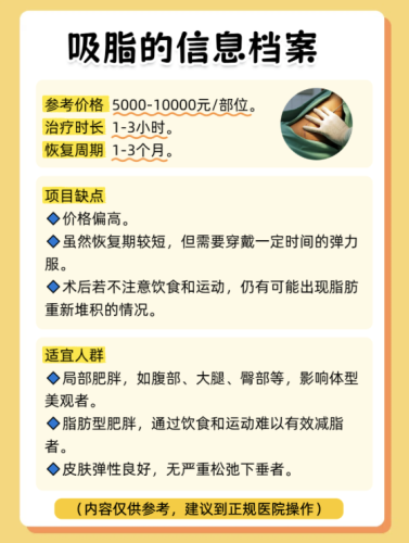 臀部吸脂和背部吸脂价格分别为10000元和8000元。全身吸脂价格则需根据部位及吸脂量而定,需面诊评估,大致在50000-100000元之间。