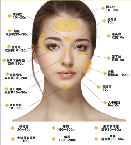 额头:轻度抬头纹25-50单位,重度30-60单位;眉间纹女生20单位,男生20-35单位,肌肉猛男甚至要35-50单位!