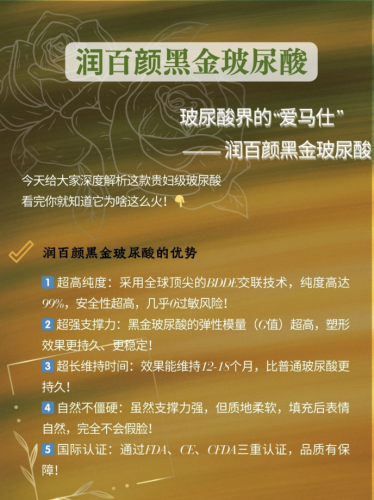 润百颜黑金属于大分子玻尿酸,质地硬,支撑力强,就像给皮肤安了个坚固的“小支架”,很适合用来塑造面部轮廓,比如隆鼻、丰下巴等。从价格和效果综合来看,它性价比还是挺高的。和一些进口高端玻尿酸相比,润百颜黑金价格相对亲民,效果却不差。而且,它是国产知名品牌,质量有保障,在国内市场占有率也比较高。不过,它的价格还是要比一些普通国产玻尿酸贵一点,但在维持时间和塑形效果上更有优势。
